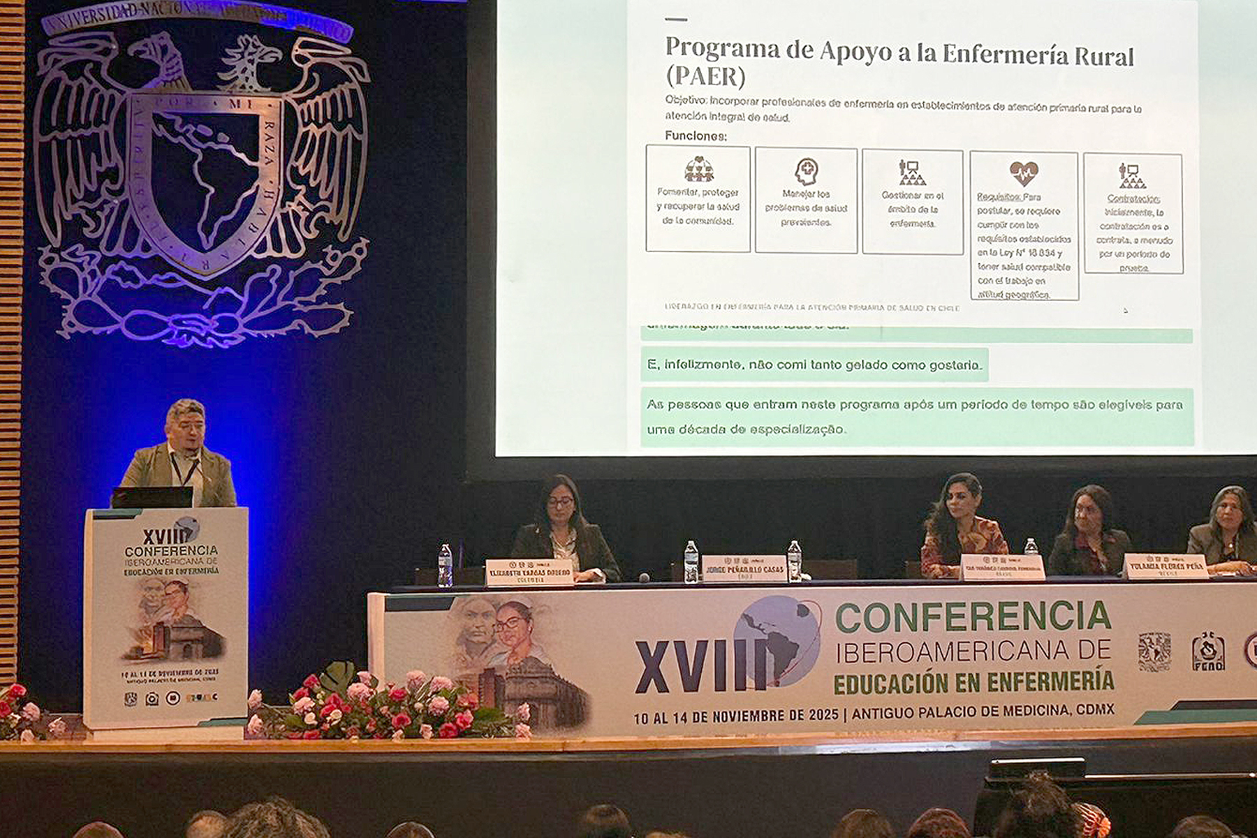 Invitado en reconocimiento a su trayectoria y compromiso en la formación de técnicos y profesionales de Enfermería, Jorge Peñailillo, Enfermero UACh e integrante del equipo rural del CESFAM de Río Bueno, expuso en la XVIII Conferencia Iberoamericana de Educación en Enfermería ALADEFE, en relación con la implementación del Modelo de Salud Familiar en contextos rurales y urbanos.